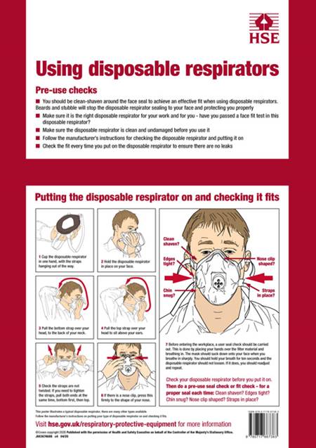 The user should then carry out a pre-use seal check or fit check. This poster gives guidance on how to put on disposable respirators and how to do a pre-use seal.